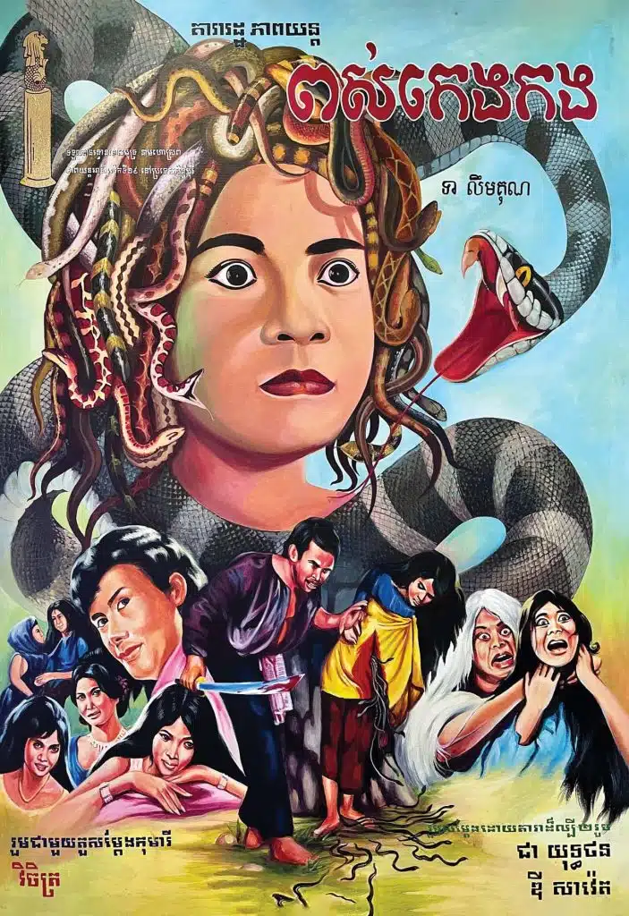 Deeply rooted in Khmer folklore, horror films embraced the allure of Nagas, snakes, and Aps. One of the earliest successful Cambodian horror films, “Pous Keng Kang or The Snake King’s Wife,” directed by Tea Lim Koun in 1970, boasts a star-studded cast, including Dy saveth, Chea Yuthorn, and Sak Sisbong. The film weaves a spellbinding tale of a young woman’s love for a part-snake, part-human creature, and the formidable challenges she faces from a jealous stepmother. Even today, it remains a beloved household favorite across the nation.